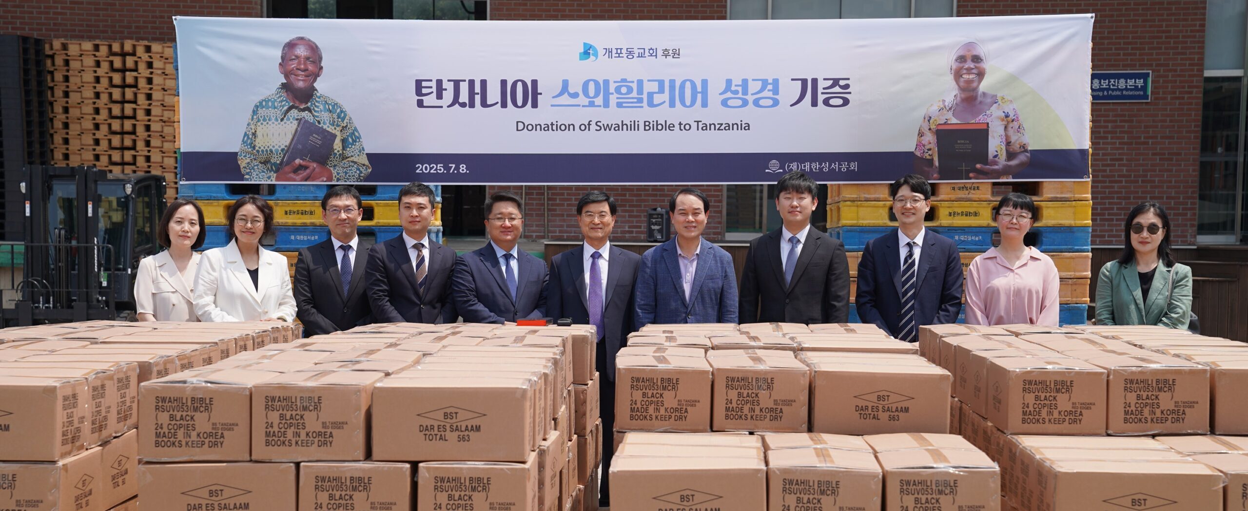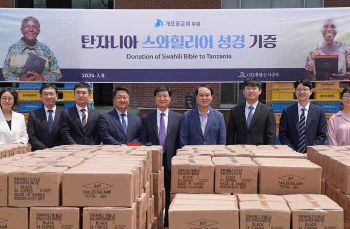 대한성서공회(이사장 이선균 목사, 사장 권의현)에서는 지난 7월 8일 개포동교회(이풍인 목사 시무)의 후원으로 탄자니아에 ‘스와힐리어 성경’ 5천643부를 보내는 기증 예식을 가졌다. 개포동교회는 올해 부활절 헌금을 성경 후원에 사용하며, 작년 6월 르완다에 ‘킨야르완다어 성경’ 5천 부 후원 이후 두 번째로 해외 성경 기증에 동참했다.