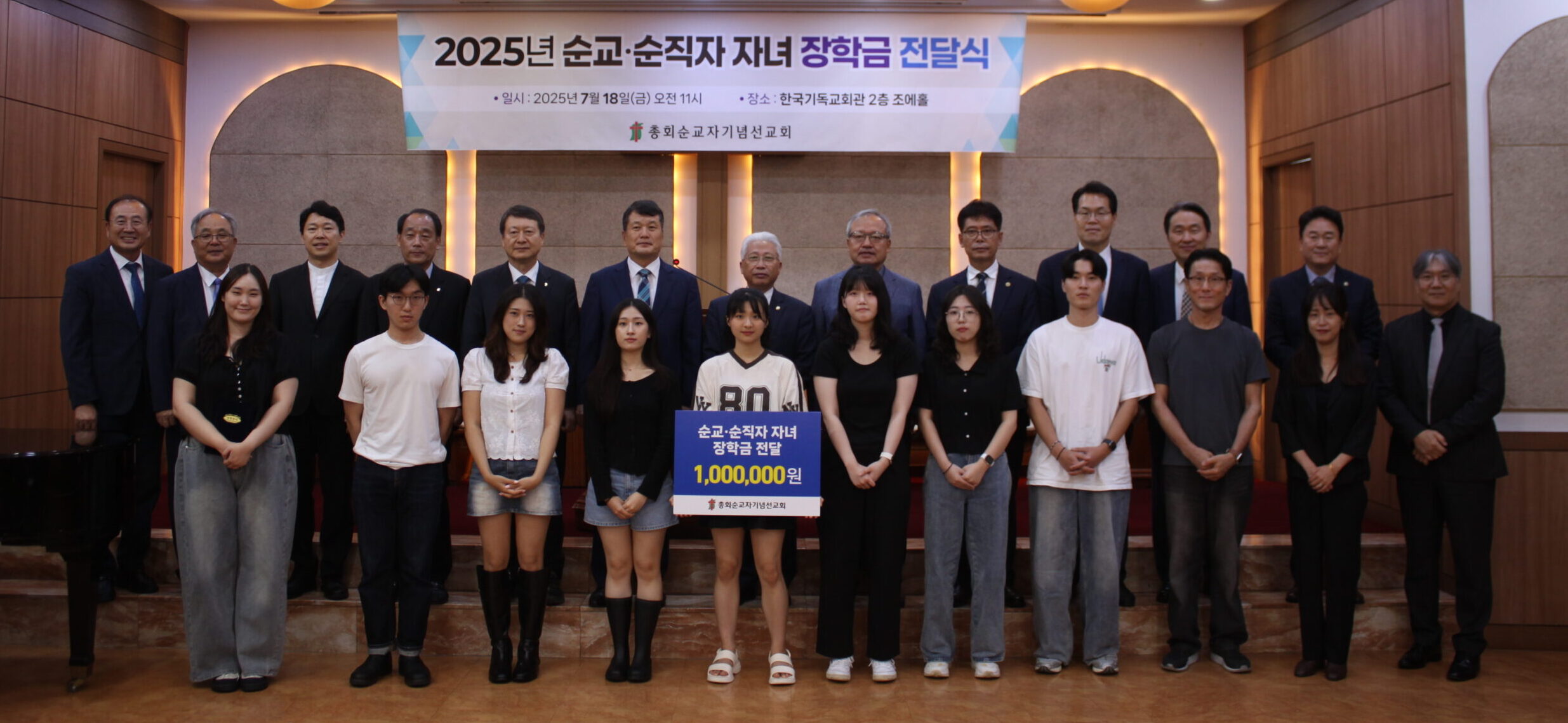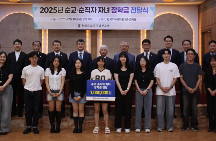 총회 순교자기념선교회(회장 이승철 장로)는 지난 7월 18일 한국기독교회관 2층 조에홀에서 2025년도 순교·순직자 유가족 장학금 전달식을 개최했다. 이날 장학금은 총회(총회장 김영걸 목사), 영락교회(김운성 목사 시무), 새문안교회(이상학 목사 시무), 무학교회(윤동일 목사 시무), 남대문교회(윤장훈 목사 시무), 소망교회(김경진 목사 시무)가 후원했다.