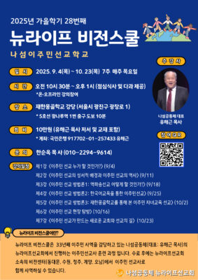 나섬공동체(대표 유해근 목사)는 오는 9월 4일부터 10월 23일까지 7주간 재한몽골학교 강당에서 뉴라이프선교회 주관으로 ‘뉴라이프 비전스쿨’ 28기를 개강한다.