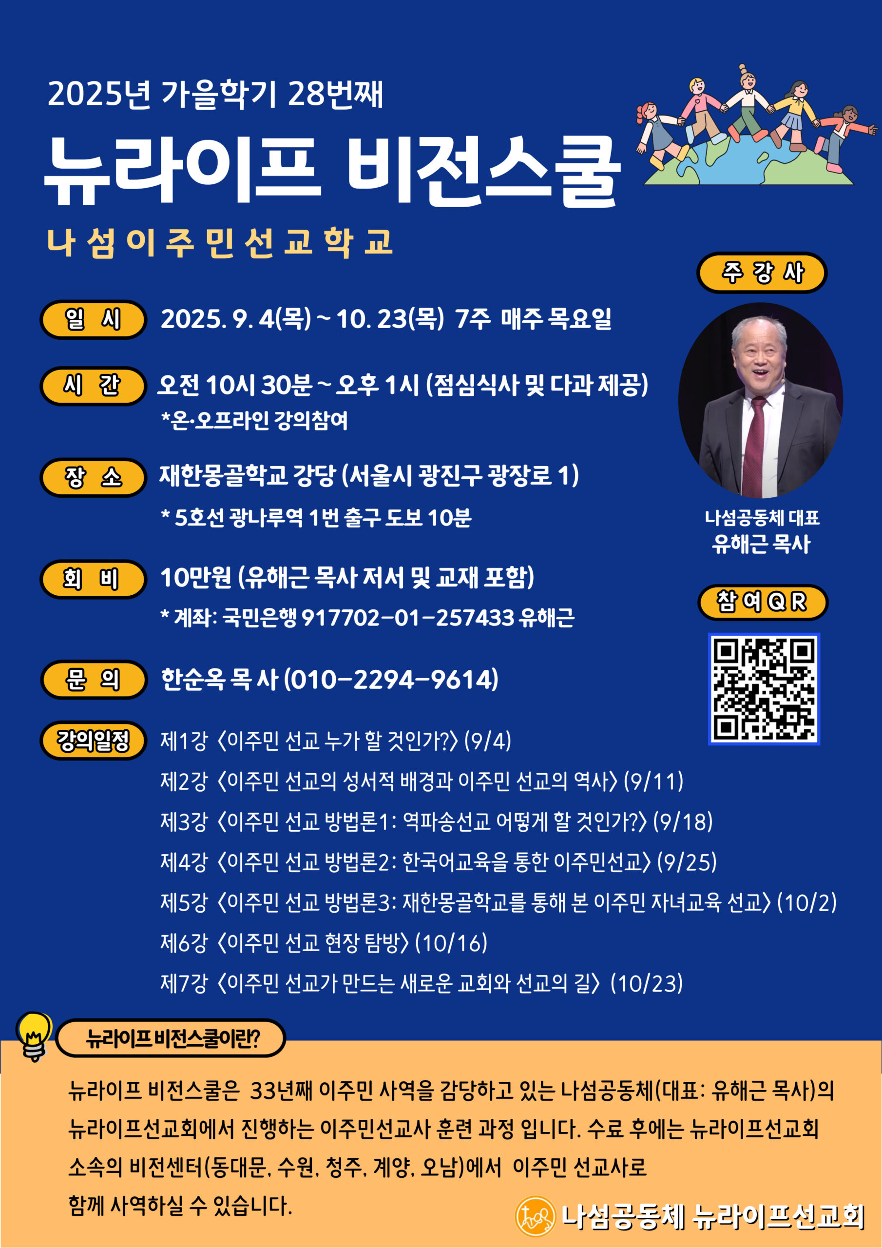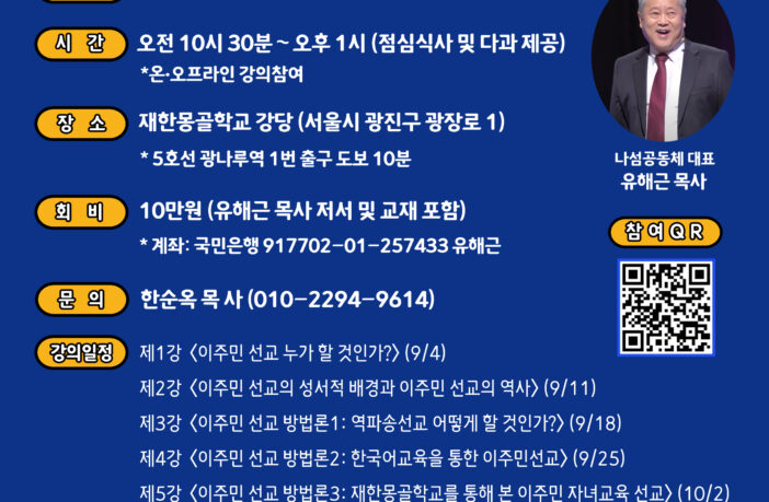 이번 28기 과정은 이주민 선교의 신학적 배경부터 실천적 접근(역파송선교, 자녀교육, 한국어 교육, 현장 탐방 등)까지 균형 있게 구성된 커리큘럼으로 마련되었으며, 마지막 주에는 ‘새로운 교회와 선교의 길’이라는 주제로 선교적 성찰과 적용의 시간을 갖는다. 강의는 매주 목요일 오전 10시 30분부터 오후 1시까지이며 오프라인과 온라인으로 동시 참여할 수 있다. 33년간 이주민 선교 현장에서 헌신해 온 나섬공동체 대표 유해근 목사가 전 강의를 맡아, 이주민 선교의 이론과 실제를 아우르는 깊이 있는 교육을 제공한다. 수강생들은 강의를 통해 한국 사회 속 이주민과 다문화 이웃을 향한 선교적 비전과 구체적인 실천 방법을 배우게 된다.