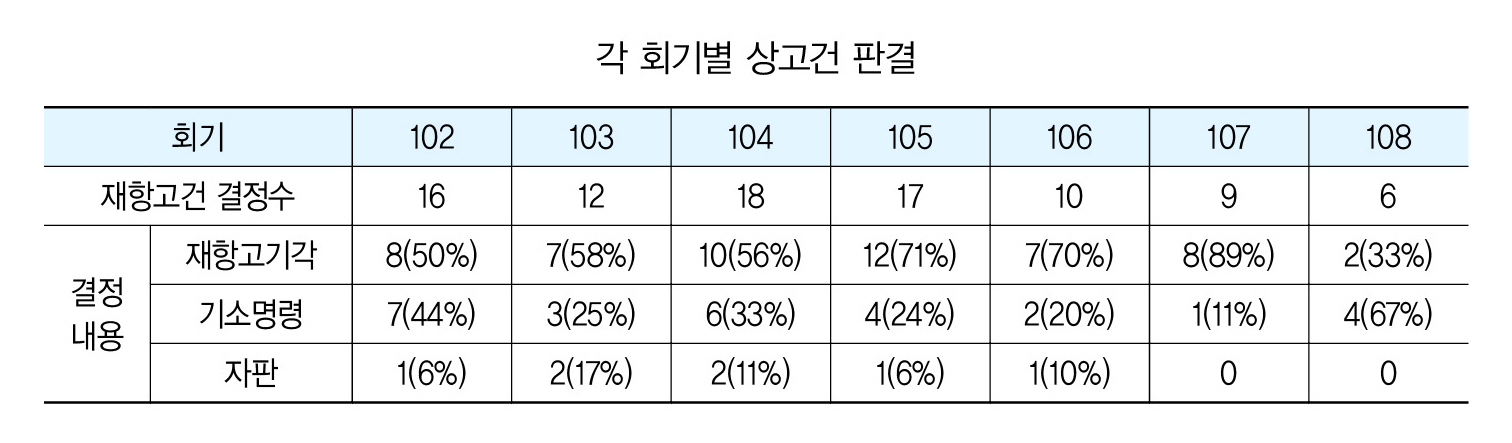 총회재판국에 이첩되어 심리, 결정한 재항고건은 상고건에 비교될 만큼 비슷한 사건수를 차지하고 있다. 7년간 총회재판국에서 판결한 전체 사건의 24%를 차지한다. 비교적 적지않은 사건수이다. 그런데 이첩된 재항고건에 대해 총회재판국이 결정한 내용을 살펴보면 재항고기각(61%)에 비해 기소명령(32%)이 상당수를 차지한다는 것이다. 이는 노회 기소위원회의 법적 판단을 무시한 기소권의 남용으로 지적될 수 있다. 이는 사법체계의 공정성과 중립성을 훼손할 수 있는 중대한 문제가 될 수 있다.