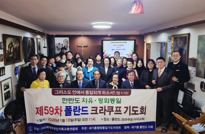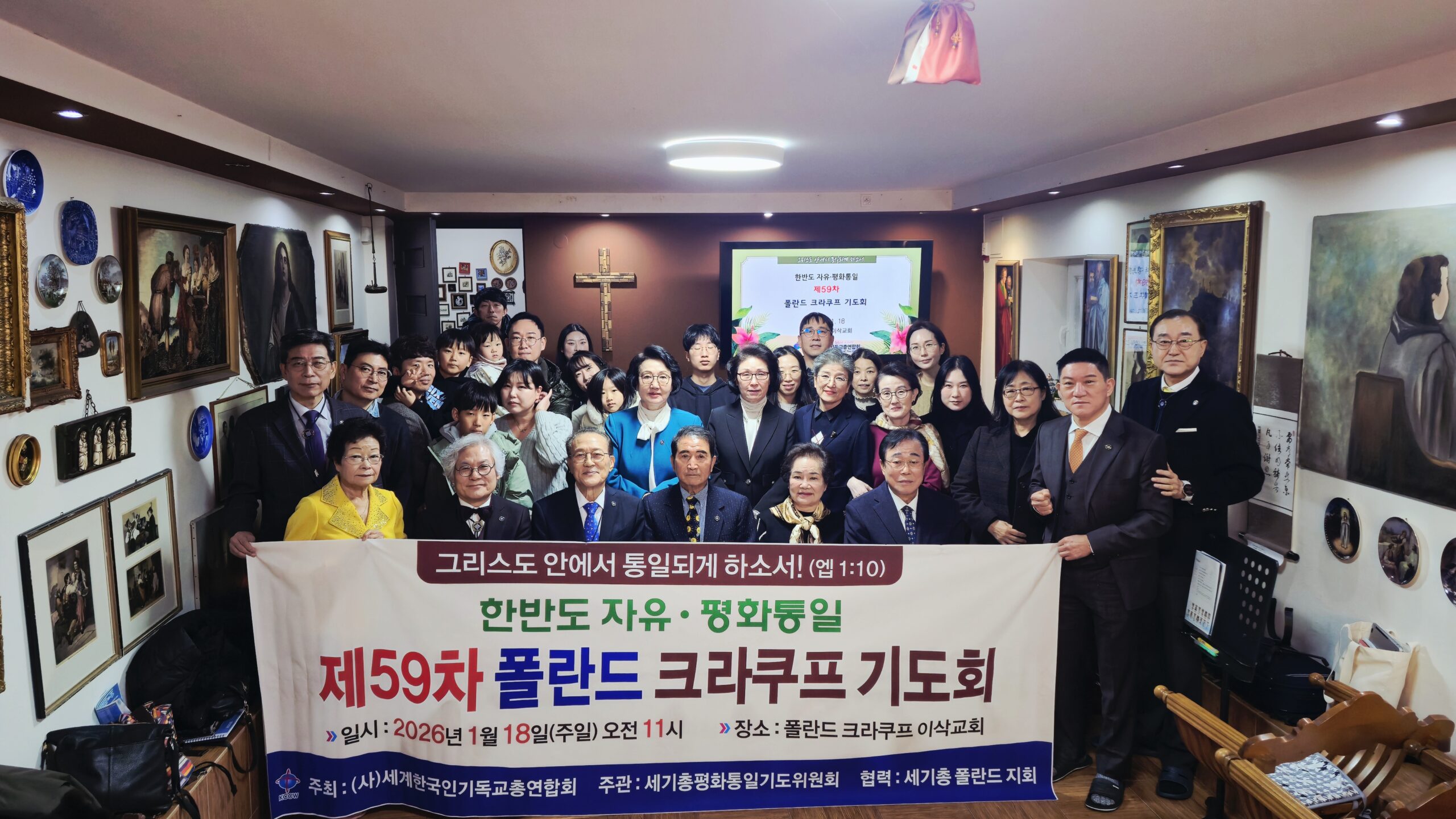 사단법인 세계한국인기독교총연합회(대표회장 전기현 장로, 이하 세기총)는 지난 1월 19일 폴란드 크라쿠프 이삭교회에서 ‘제59차 한반도 자유, 평화통일 폴란드 크라쿠프 기도회를 개최하고, 한반도 평화통일에 대한 간절한 염원을 모으는 시간을 가졌다.