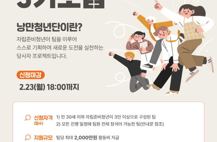낭만청년단 3기는 오는 2월 23일 오후 6시까지 모집하며, 만 30세 이하 자립준비청년 3인 이상 구성된 팀이라면 신청 가능하다. 기타 자세한 사항은 ‘자립정보ON’ 홈페이지에서 확인할 수 있다.