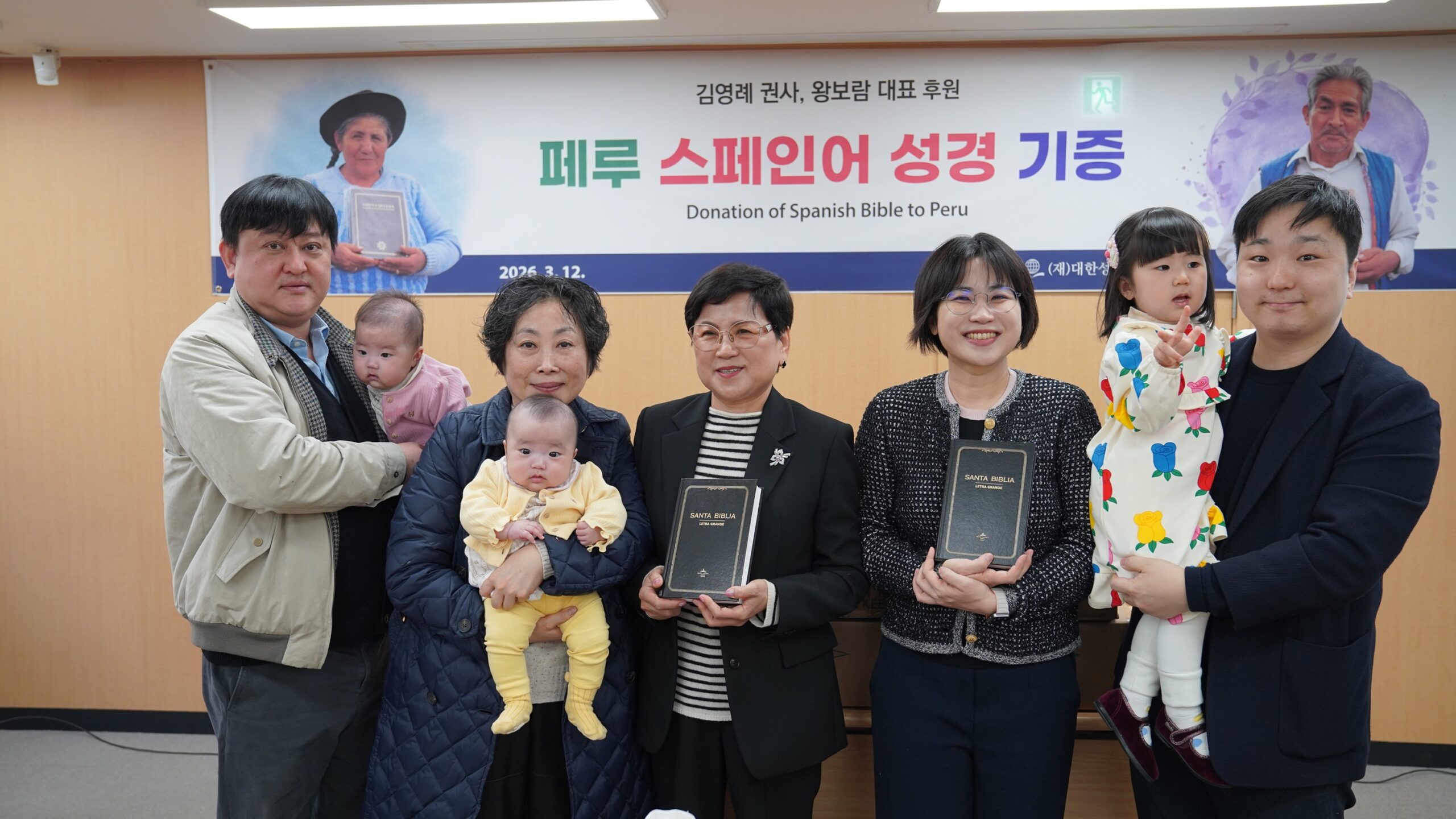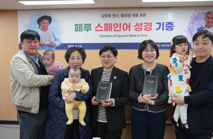 대한성서공회(이사장 이선균 목사)는 지난 3월 12일 김영례 권사(대한성서공회 홍보대사), 왕보람 대표의 후원으로 페루에 <스페인어 성경> 1만 4천 800부를 보내는 기증 예식을 가졌다.