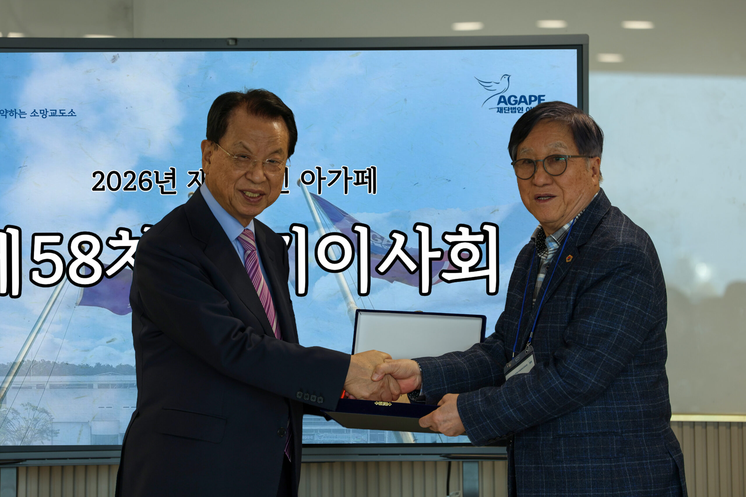 재단법인 아가페(이사장 김삼환 목사)는 지난 3월 24일 소망교도소에서 제58차 정기이사회를 열고, 소망교도소 설립 초기부터 재단과 사역을 위해 헌신해 온 권오형 장로에게 공로패를 전달했다. 이번 정기이사회는 소망교도소 개청 16주년을 지나오며 그동안의 사역을 돌아보고, 설립 초기부터 오늘에 이르기까지 소망교도소의 운영과 정착을 위해 수고한 이들의 헌신을 되새기는 뜻깊은 자리로 마련됐다. 재단법인 아가페는 이날 오랜 기간 감사로 섬겨 온 권오형 장로의 헌신과 수고에 감사의 뜻을 전했다.